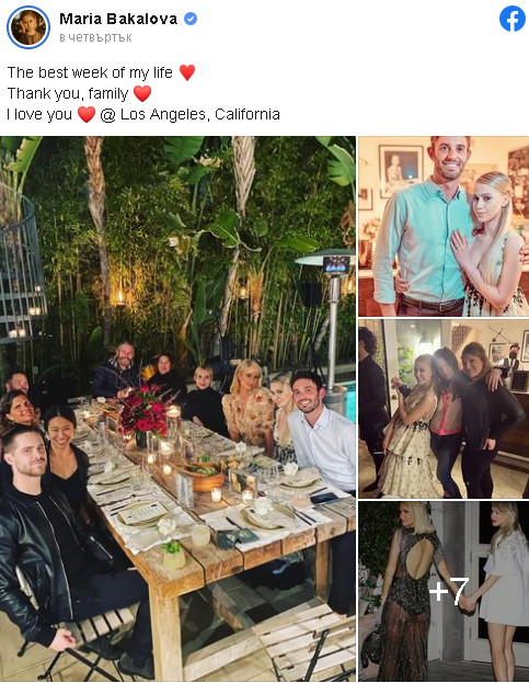 Актрисата публикува няколко кадъра от сбирката по повод годишнината от годежа на Хилтън и избраника и Картър Реум, на която бе придружена от своя продуцент Кейт Хъдсън, който работи за една от най-големите агенции за таланти в Холивуд. „Това беше най-хубавата седмица от моя живот! Благодаря ви семейство! Обичам ви!“, написа Мария в личния си Instagram. Празничната вечеря се състоя в дома на Парис, в двора край басейна, а Мария е била настанена точно до нея. Двете дами бързо се сприятелили.