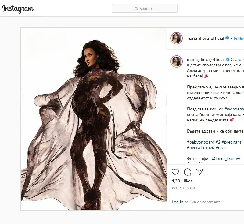 \"С огромно щастие споделям с вас, че с Александър сме в трепетно очакване на бебе! Прекрасно е, че сме заедно в това пътешествие, наситено с любов, отдаденост и смисъл! Поздрав за всички Супержени, които борят демографската криза напук на пандемията. Бъдете здрави и се обичайте!“, написа тя.
