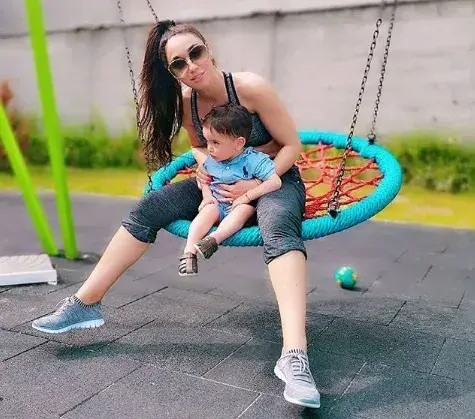 В официалния си профил в Инстаграм изпълнителката на „Сама“ публикува кадър със сина си Александър и допълни с текст: „Александър се старае да ме държи във форма и след тренировка. Никога не е късно да усетиш щастието от редуване на интензивна фитнес програма с популярния за майките спорт „тичане след бебе“.
