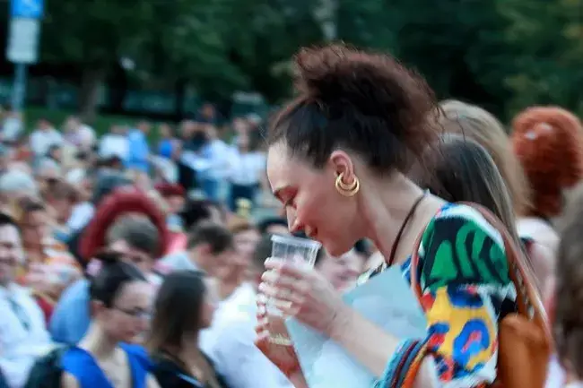 49-годишната бивша моделка бе избрала цветна рокля на френски моделиер за събитието, като през цялото време, докато се наслаждаваше на изпълненията, отпиваше от шише с вода, която носеше в огромната си чанта.