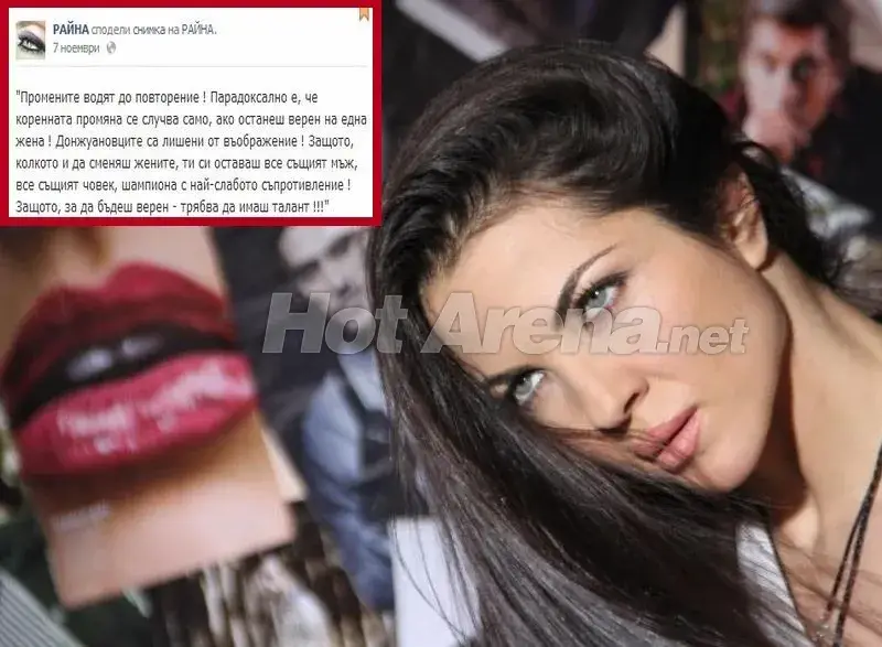 „Промените водят до повторение! Парадоксално е, че коренната промяна се случва само ако останеш верен на една жена! Донжуановците са лишени от въображение! Защото, колкото и да сменяш жените, ти си оставаш все същият мъж, все същият човек, шампионът с най-слабото съпротивление! Защото, за да бъдеш верен - трябва да имаш талант!!!“ – това написа във Фейсбук Райна.