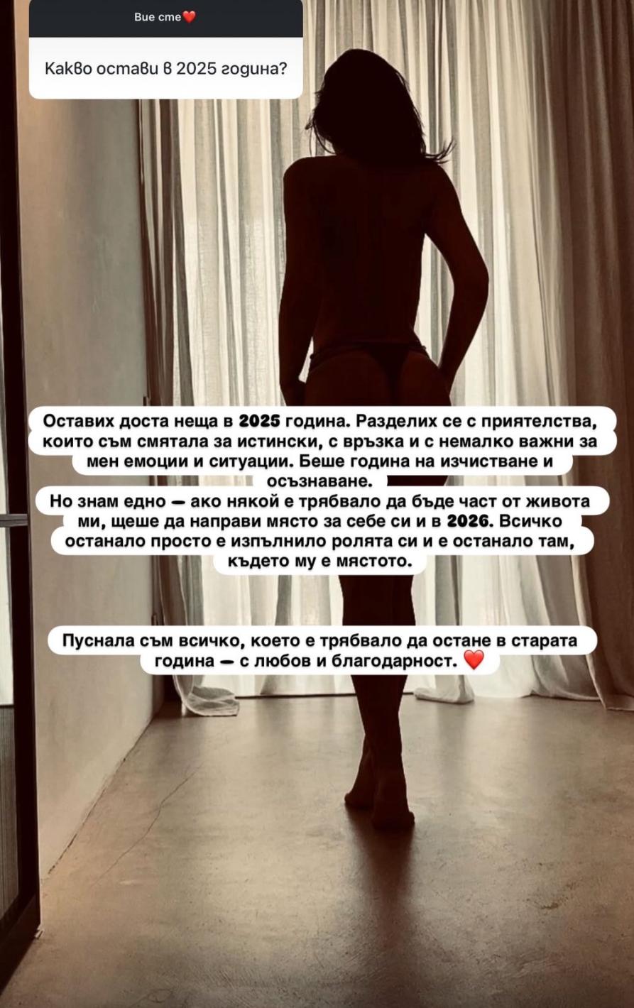 Изглежда, че пловдивската красавица е взела важни решения и е готова да остави всичко, което не я подкрепя, зад себе си. „Ако някой е трябвало да бъде част от живота ми, щеше да направи място за себе си и в 2026.“ Тези думи на Венцислава говорят много за нейното самоосъзнаване и смелост да се отдели от това, което не ѝ служи.