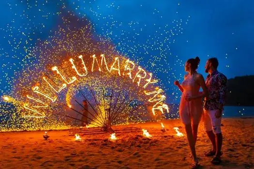 Щастливата новина сподели бъдещата букла, като качи фотоси от романтичното предложение, което й е направил любимият й на плажа в Пукет, Тайланд. Там влюбеният Бонев направи незабравимо предложение на миската, като изписа с огнени букви „Омъжи се за мен“.
