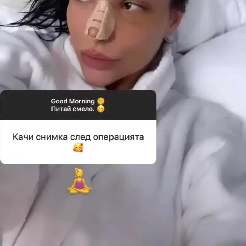 Жасмина от няколко дни споделя снимки и видеа в социалните мрежи от Турция, посещавайки скъпи ресторанти и хотели от града край Босфора. Чак днес в едно от сторитата си Жаси публикува видео, в което лежи в болнично легло с лонгета на носа и леки отоци около очите, писа Телеграф.