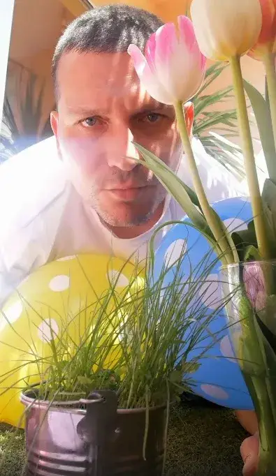 В продължение на няколко минути водещият се крие зад стрък трева в саксия и букет лалета на слънчева тераса. Има и три балона - розов жълт и син, всички на бели точки, които се появяват във видеото.