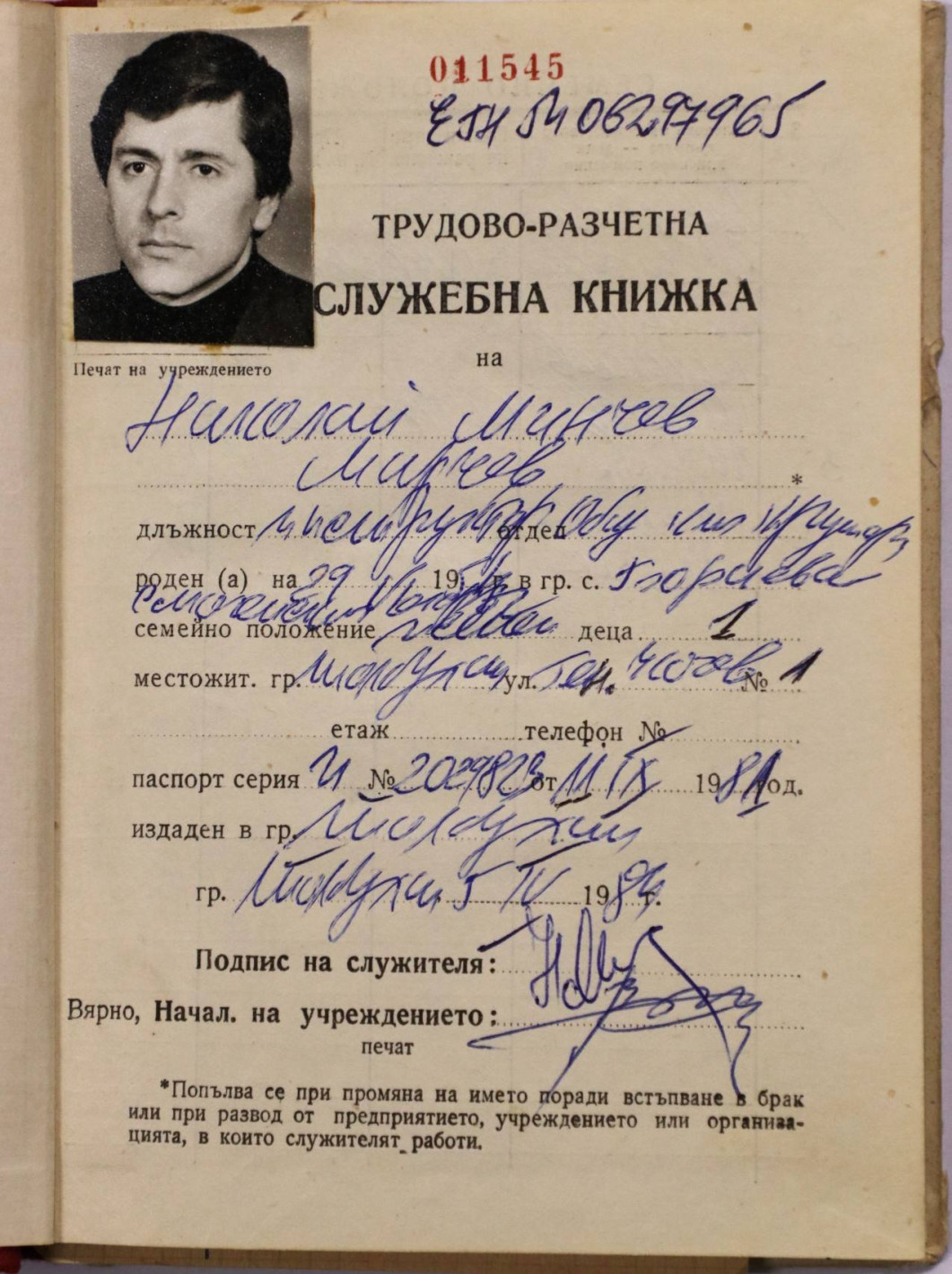Заведената в ЦК на БКП т.н. трудово-разчетна служебна книжка с № 011545 на Николай Минчев Мирчев
