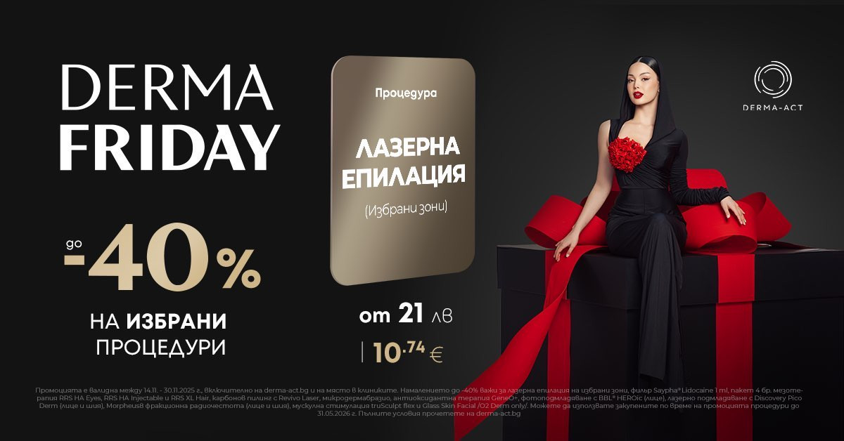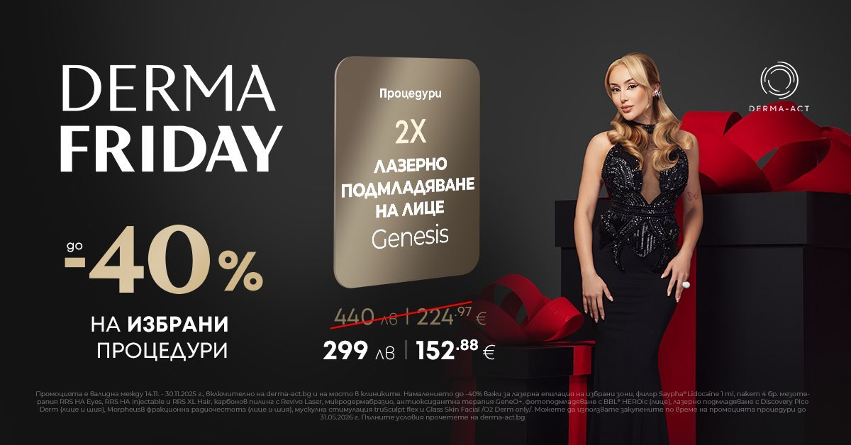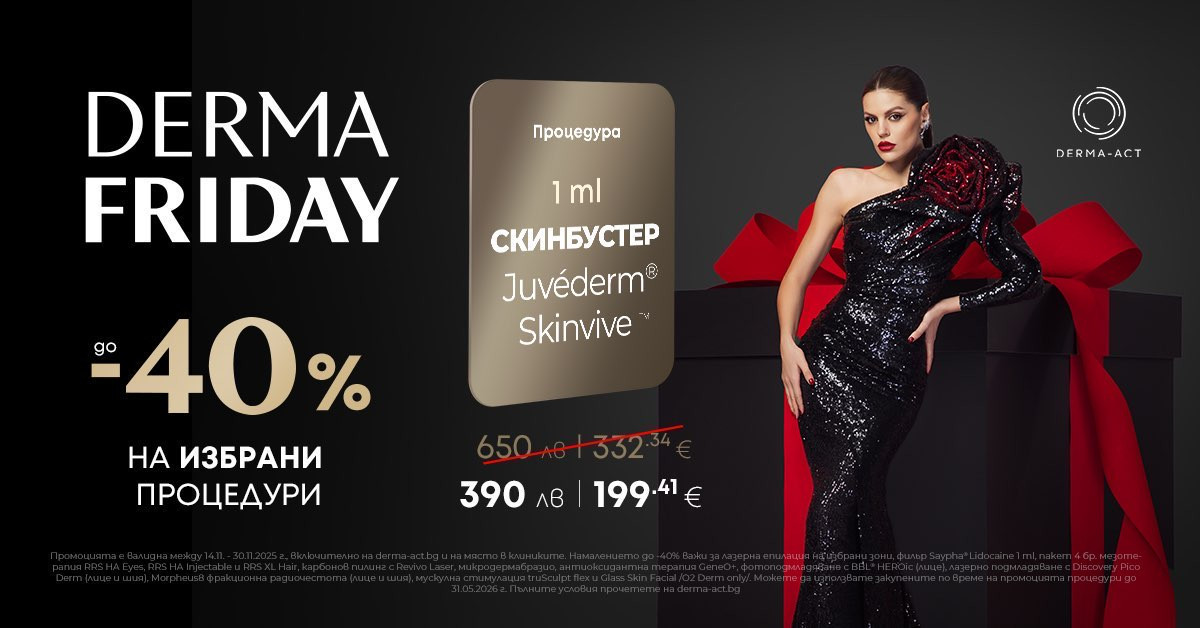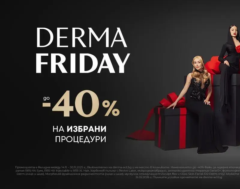 Клиники Derma-Act предлагат невероятни отстъпки до 40% на подбрани естетични процедури! От 14 до 30 ноември 2025 г. не пропускай шанса си да се погрижиш за себе си на изключителни цени. Защо да чакаш? Вземи своята красота сега и плати по-късно, благодарение на партньорството с tbi bank! Не позволявай на времето да те подмине!