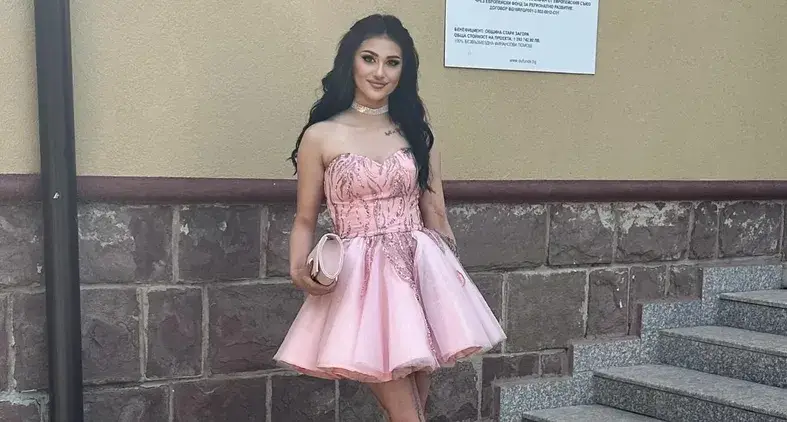 Момичето от Стара Загора се показа с розов тоалет и обувки и перлена огърлица. Късата рокля не скрива белезите по краката й от рязането, но и абитуриентката не изглежда да ги крие и да се притеснява от зарасналите рани.