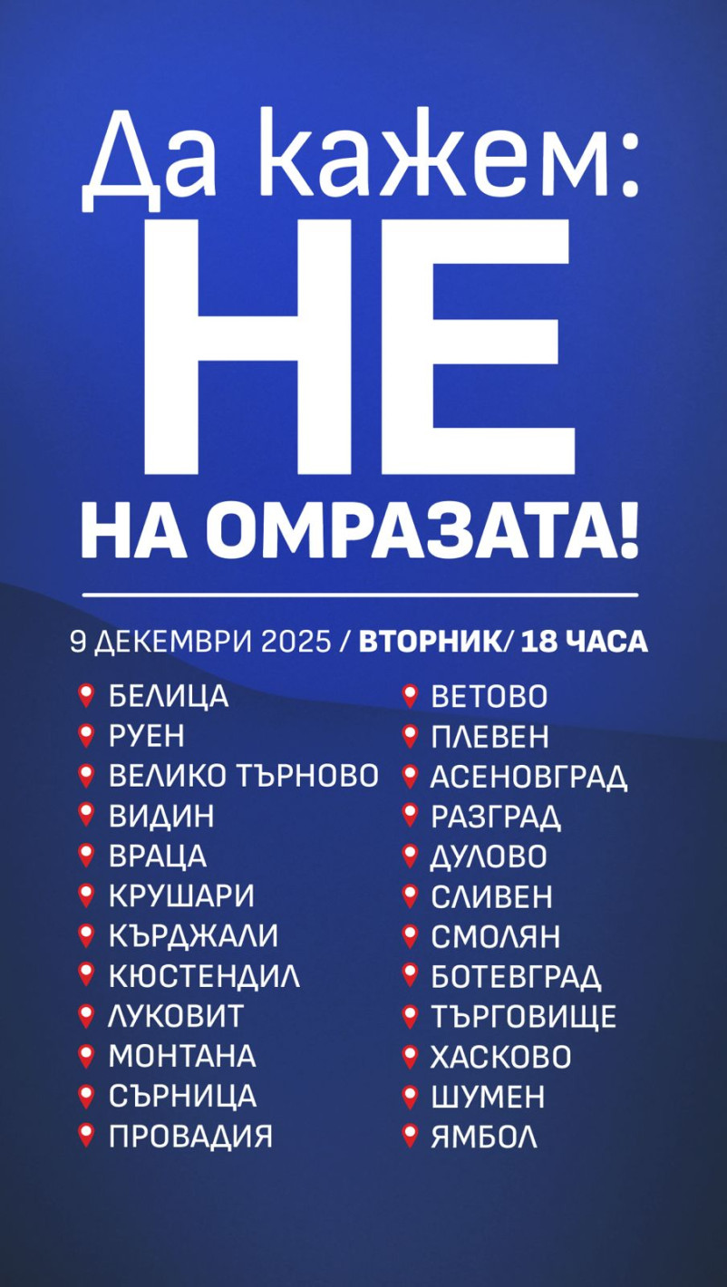 На 9 декември 2025 г. България ще бъде разтърсена от митинги, организирани от ДПС. Причината? Политическото напрежение и опитите за дестабилизация на страната! Времето е спешно! В навечерието на въвеждането на еврото, активистите ще изразят своята позиция: "НЕ на омразата!"