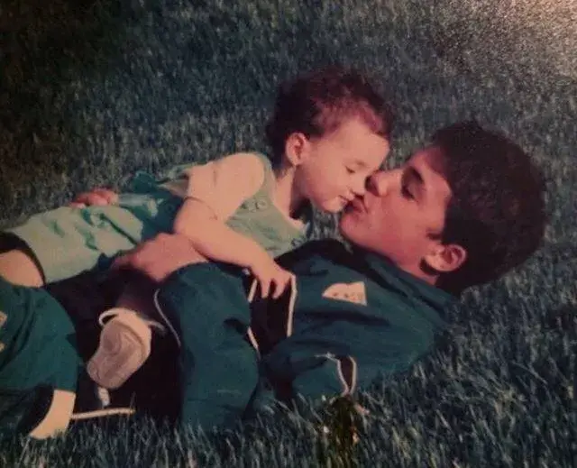 Публикува кадър, на който е легнал на поляна, а в ръцете си държи Елинор, която тогава е била малко бебенце.
