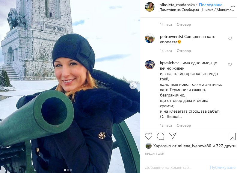 Маданска сподели патриотичната снимка в мрежата, като добави и откъс от стихотворението на Вазов \"Опълченците на Шипка\". Красавицата обича да обикаля страната и често се снима до забележителности, пише \"България Днес\".