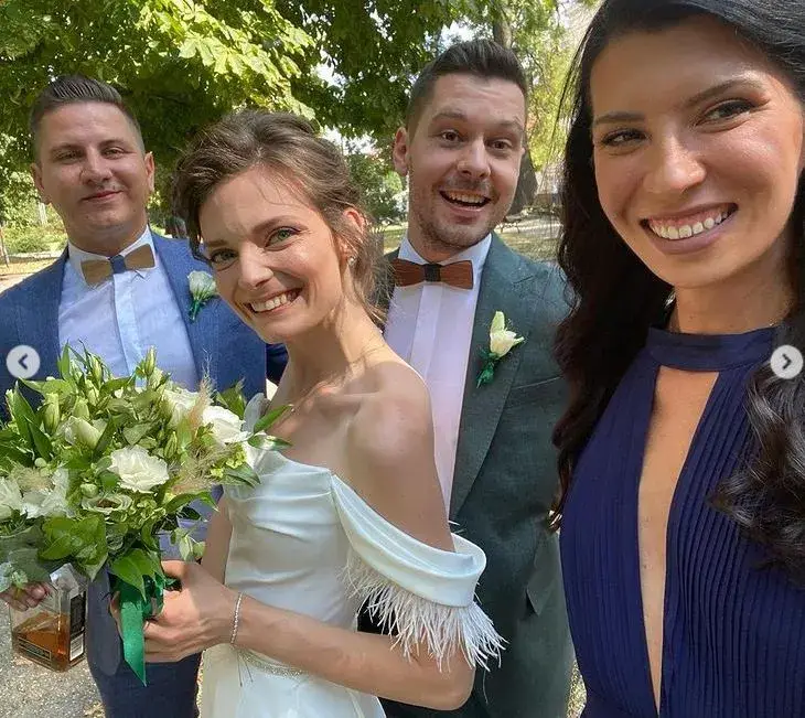 До олтара сегашната водеща ба заведена от баща си, която е дългогодишен шеф на историческия музей в родното й Панагюрище. Майка й се отиде преди две години. Младоженците предпочетоха да заложат на бели маратонки и кецове вместо на класически официални обувки, за да могат да се насладят на вечерта.