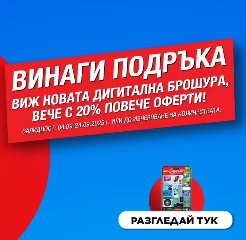 Новата дигитална брошура на Техномаркет идва с нови, още по-неустоими оферти!Разгледай любими марки и модели, възползвай се от СУПЕР изгодни предложения и пазарувай лесно, бързо и удобно от Техномаркет!