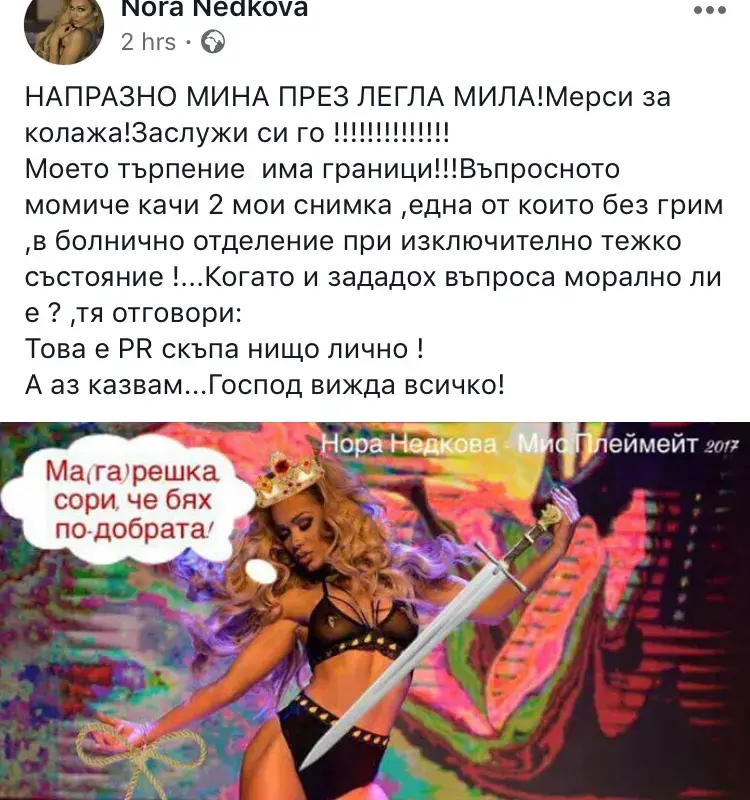 “Напразно мина през легла, мила! Заслужи си го! Моето търпение има граници! Въпросното момиче качи 2 мои снимка, една от които без грим, в болнично отделение при изключително тежко състояние !... Когато й зададох въпроса морално ли е, тя отговори: Това е PR скъпа нищо лично! А аз казвам... Господ вижда всичко!”