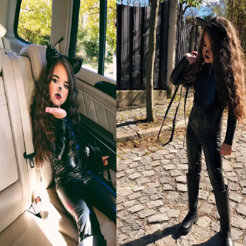 Дъщерята на Лозанова влиза в ролята на сладка, малка котка, облечена отгоре до долу в черна кожа. Тоалетът й е допълнен от черни ботушки, модерна черна раничка и диадема с кожени ушички. Косата на Никол както винаги е перфектна и гордост за нейния фризьор. Игривите къдрици я правят истински бонбон!
