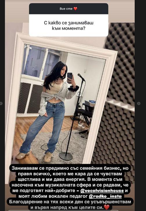 „Занимавам се предимно със семейния бизнес, но правя всичко, което ме кара да се чувствам щастлива и ми дава енергия. В момента съм насочена към музикалната сфера и се радвам, че ме подготвят най-добрите – Vocal Vision House и любимият ми вокален педагог Радко. Благодарение на тях всеки ден се усъвършенствам и вървя към целите си“, разкри пред последователите си в Инстаграм Венцислава, която от доста време насам работи с победителя от „Гласът на България“ Радко Петков.