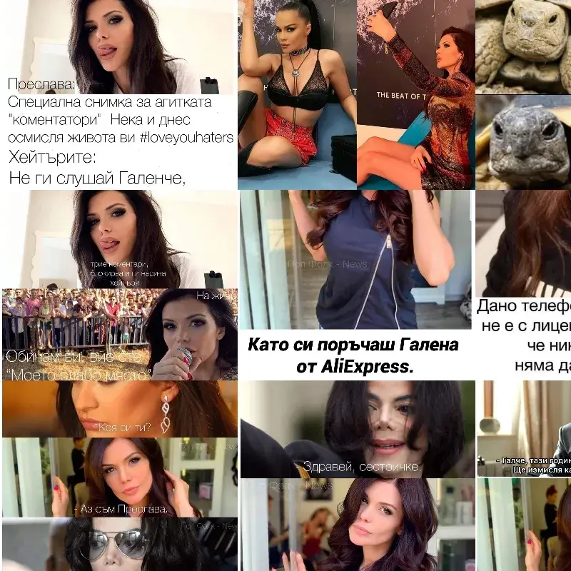 В сигнал до Горещата арена пристигнаха всички колажи, пускани до момента за Преслава, които целят да я осмеят. Първият, който ще видите в галерията по-долу, е как изпълнителката на „Водка с утеха“ е избрала да си прави селфи на място, на което преди това конкурентката й Галена се е щракнала.