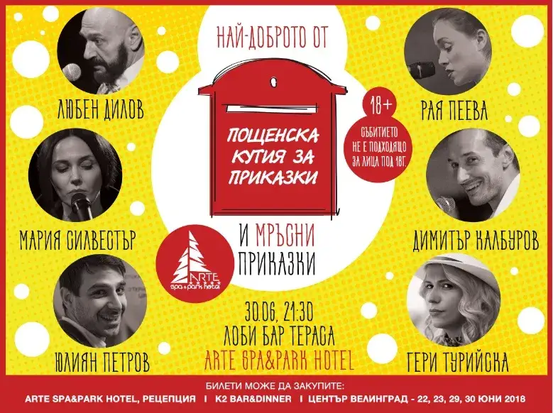 „Пощенска кутия за приказки (и мръсни приказки +18)“, чийто създател е Гери Турийска, пристига и във Велинград, за да покаже най-доброто от всичките си издания! Това ще се осъществи в Arte Spa&Park Hotel на 30 юни, като за мероприятието се очакват видни звездни гости, ама от онези, които харесвате… Не от другите, които като ги видите и си казвате: „Оф, пак ли тези?“.