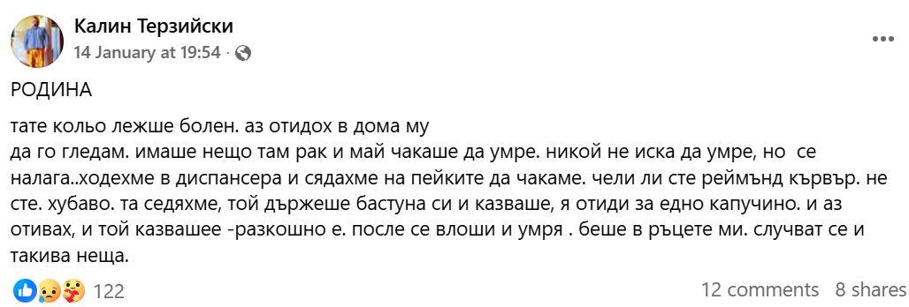 На 22 януари, Калин Терзийски напусна този свят, оставяйки след себе си шокираща последна публикация, която разкрива дълбоките му размисли за живота и смъртта. Близките му, сред които и брат му Светослав Терзийски, споделиха, че той е предчувствал края си. Въпреки че беше обичан от мнозина, Калин често се е чувствал неразбран, а последните му думи резонират с дълбока тъга: "Никой не иска да умре, но се налага…"