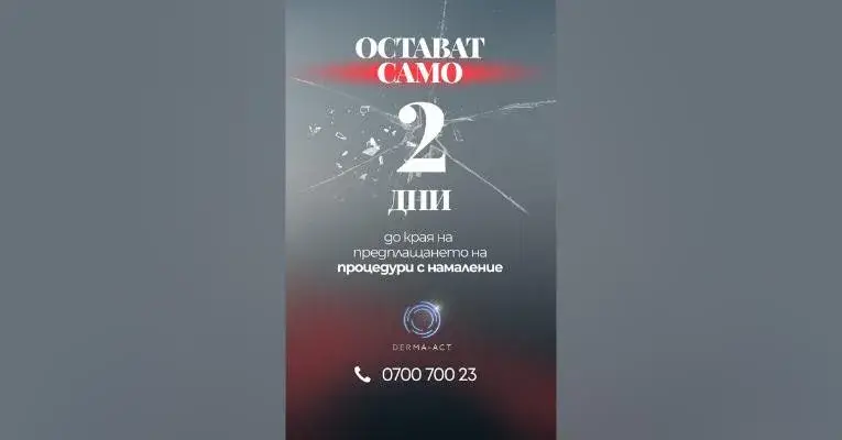 Лятното намаление на Derma-Act е валидно за ограничен период. Поради това при запазване на час ще се дава предимство на пациентите с предплатени процедури. Закупените процедури не гарантират конкретен специалист. Можете да закупите процедури с до 50% намаление в периода от 18.07. до 2.09.2025 г. Предплатете процедури до 2.09. и ги използвайте до 15.10. Запазете час на телефон 0700 700 23.