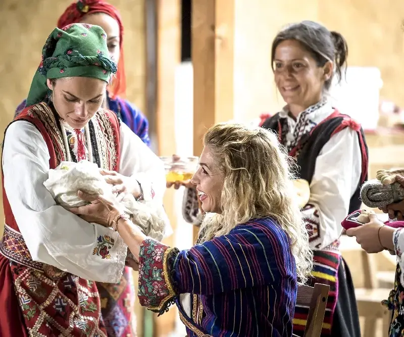 Пчеларката Надя и собственичката на заведение Мария собственоръчно сглобиха новородено и се втурнаха да го дундуркат. За главата на детето те използваха зелка, за косата - царевица, а произведението си увиха в пелена. Зеленчуковото бебе беше използвано вместо истинско по време на обичая „Погача“, който жените в стопанството трябваше да пресъздадат до последния детайл.