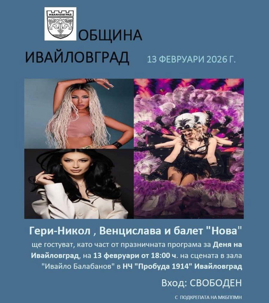 На 13 февруари Ивайловград ще бъде дом на едно от най-вълнуващите събития в родния шоубизнес! Венцислава Тафкова, Мис България 2020, и поп иконата Гери-Никол ще застанат на сцената заедно, за да зарадват феновете си по случай Деня на влюбените. Двете красавици ще изпълнят заедно хитове, а балет „Нова“ ще допълни празничната атмосфера в зала „Ивайло Балабанов“ на Народното читалище.