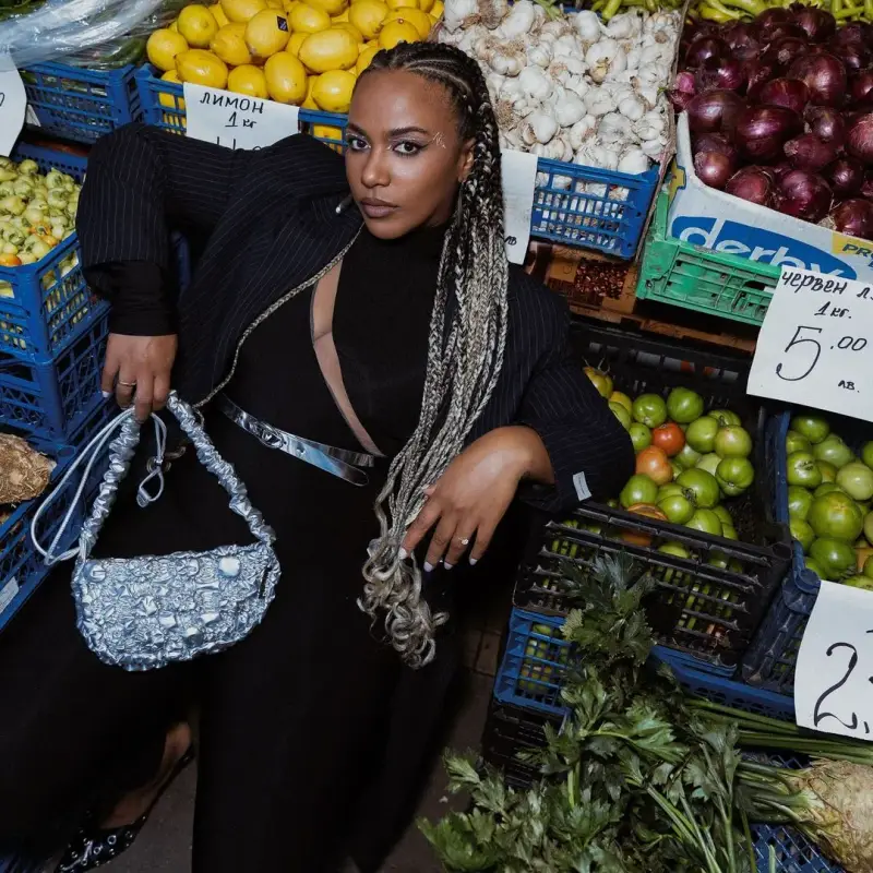Полунигерийката се облича в шикозно черно тоалетче и е хванала в ръка блестяща сребриста чанта, която грабва вниманието на всеки пазаруващ.