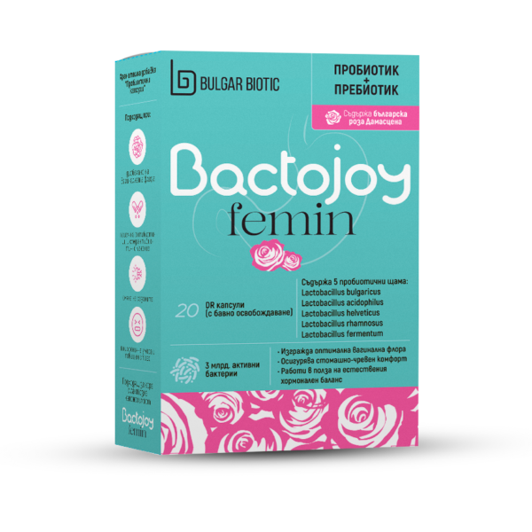 Bactojoy Femine е нов пробиотичен продукт, който благоприятства за оптималното функциониране на метаболизма и усвояването на хранителните вещества, свързани със специфичните нужди на женския организъм. Подпомага нормалната функция на имунната система, както и естествения баланс на стомашно-чревната и вагинална микрофлора, като запазва оптимално Ph и минимизира възможността за инфекции. Спомага за намаляване на възпалителните процеси. Подпомага естественото производство на късо-верижни мастни киселини. Мощен антиоксидант, подпомагащ черния дроб в очистителните процеси. Естествен източник на фибрис много лек лаксативен ефект.Има успокояващ и подмладяващ ефект. Подпомага нормалното фукциониране на стомашно -чревния тракт и укрепва защитните функции на организма. Допринася за естествения детокс на организма. Работи в полза на естествения хормонален баланс.