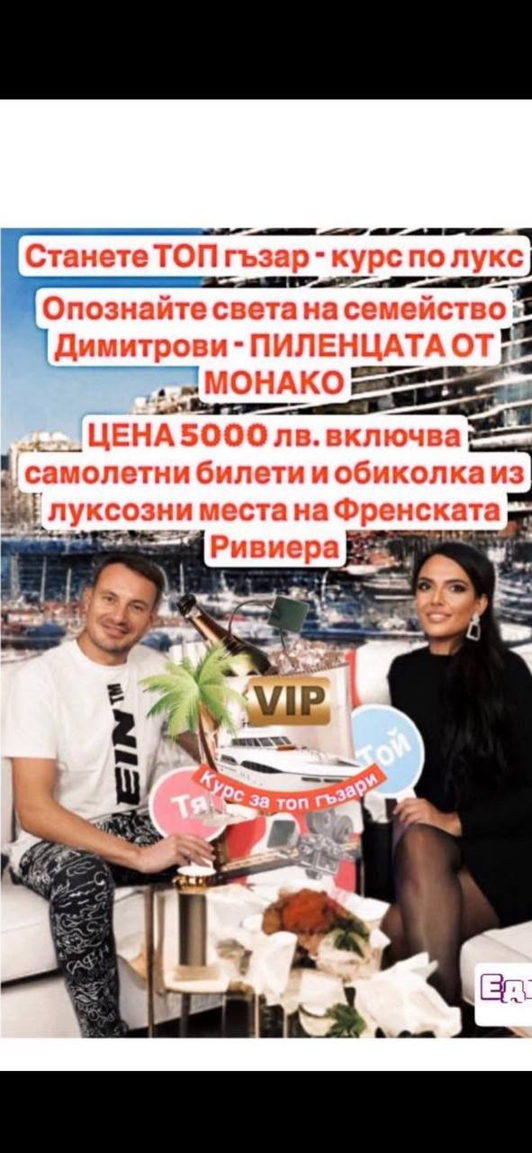 Невероятно, но факт! Борислав и Нина Димитрови, известни като „Пиленцата от Монако“, явно са в сериозни финансови затруднения. След години на показност и луксозен начин на живот, сега те просят пари от българите! В интернет се появи обява, в която предлагат двупосочен самолетен билет и обиколка на забележителностите на Френската Ривиера за космическите 5000 лв. на човек!
