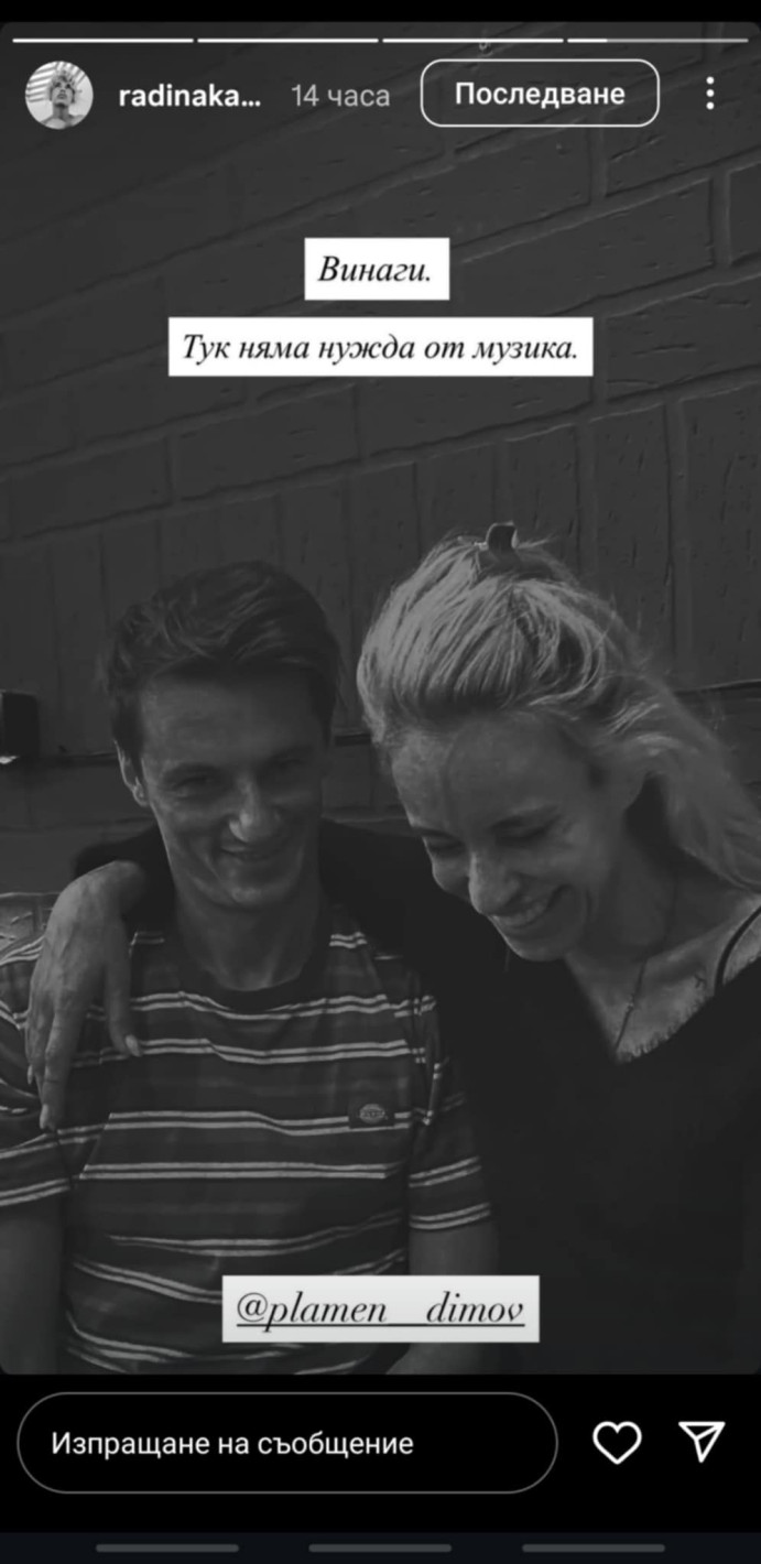 След като преминаха през труден период и изтриха всички общи снимки, двамата явно са намерили пътя обратно един към друг. А последната публикация на Радина, в която е гушнала Пламен и се смее, е придружена с надписа: „Ти си знаеш“. Но какво всъщност знае той?