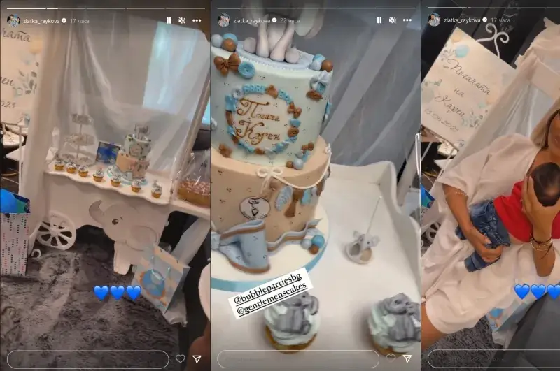 Щастливата майка показа украсата, която преобладаваше в син цвят и малки кексчета със слончета върху тях. Разбира се, на трапезата не липсваше и голяма торта със синя панделка. Преди това Злати си показа и прическата за събитието от салон за красота.