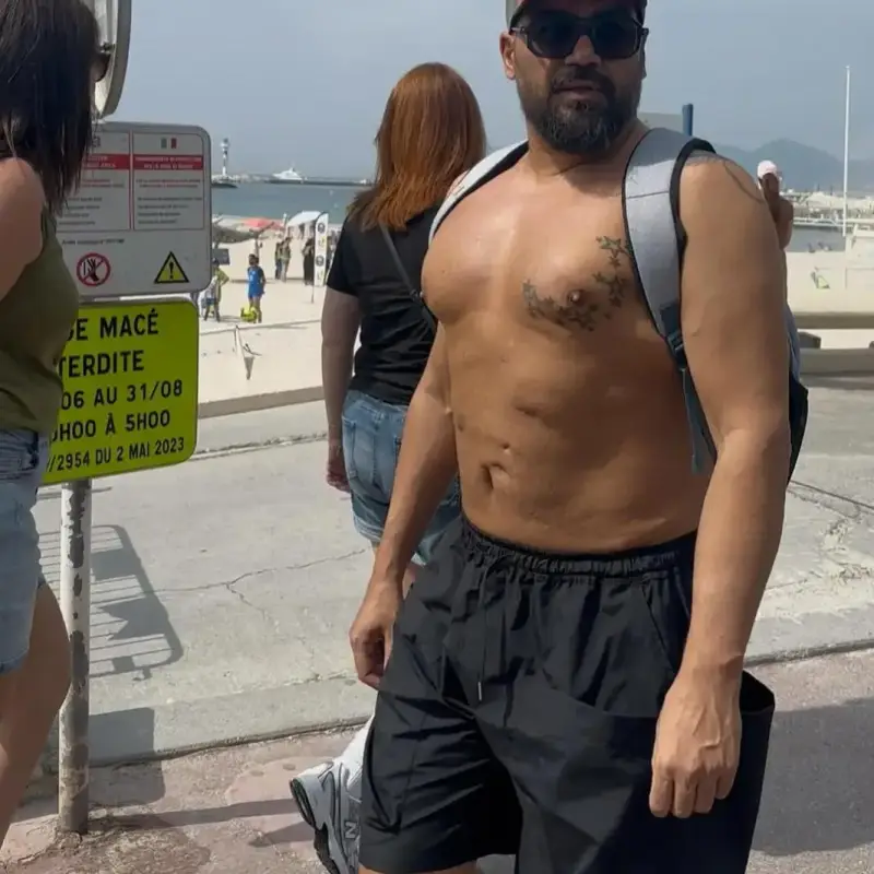 Метнал раница на голо, с шарени шорти и маратонки Азис обиикаля покрай плажовете на Кан, пише България Днес.
