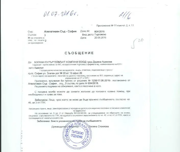 В тази връзка, бихме искали да предоставим на обществеността препис от Решение № 1250 от 17.06.2016 г. на Апелативен съд – София по дело № 804/2016. Делото, заведено от “Музикаутор” срещу “Болкан Ентертейнмент Компани”, с иск за присъждане на сумата от 171 964, 34 лева и лихви в размер на 52 784,22 лева, е отсъдено в полза на Болкан Ентертейнмент с решение на Софийски градски съд на 30.07.2015г., след което е обжалвано пред Апелативен съд – София, който потвърждава решението на първоинстанционния съд. Решението е можело да бъде обжалвано в едномесечен срок пред ВКС на РБ, но молба за това така и не е постъпила от Музикаутор, с което решението става окончателно.