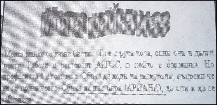 „Мама обича да пие ракия всяка вечер и с нея да си похапва салата“. Това стряскащо изказване не е признание на малчуган от проблемно семейство, а пример за съчинение на тема „Мама и аз“ поместен в учебник по информационни технологии за четвърти клас, научи HotArena.net.