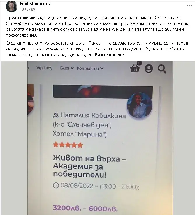 Оказа се, че в прилежащия хотел се организира семинар на сексоложката гуру спиритуал водач Наталия Кобилкина. Учила дамите по какъв начин да бъдат самостоятелни и им давала разнообразни задания. Една от тях била по какъв начин да желаят дейно пари от мъжете. В следствие разбрах, че въпросният семинар съставлява седемдневно образование с гръмкото име \" Живот на върха \", за което цените стартират от 3200 лева и стигат до 6000 лева Кобилкина ги учила по какъв начин да просят пари и да бъдат самостоятелни.