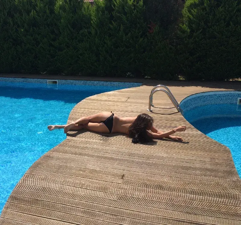 Стефчова демонстрира горещата си фигура в и около басейна, като най-вероятно фотосите са направени на същото място, на което е посрещнала рождението си, тъй като освен нея и фотографа, няма никой друг наоколо.