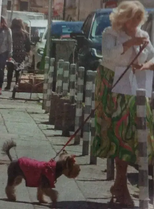Певицата привличаше погледите със свежото си, пъстро и стилно облекло, а кученцето й също грееше в розово елече.