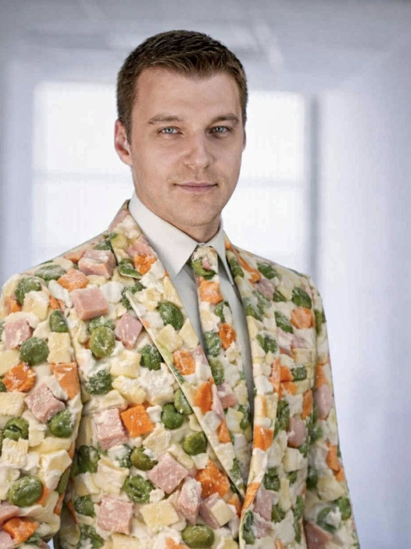 Последният фотос, който Калоферов пусна обаче, беше много сладък и шеговит, и леко шокиращ. Че как иначе, след като се появи в костюм и вратовръзка на... руска салата. Да, сами виждате, че десенът на сакото и вратовръзката му е на картофки, грахче, морковчета, шунчица и майонеза... а новинарят обясни, че това им е любимата салата у дома, на която Мила е майстор.
