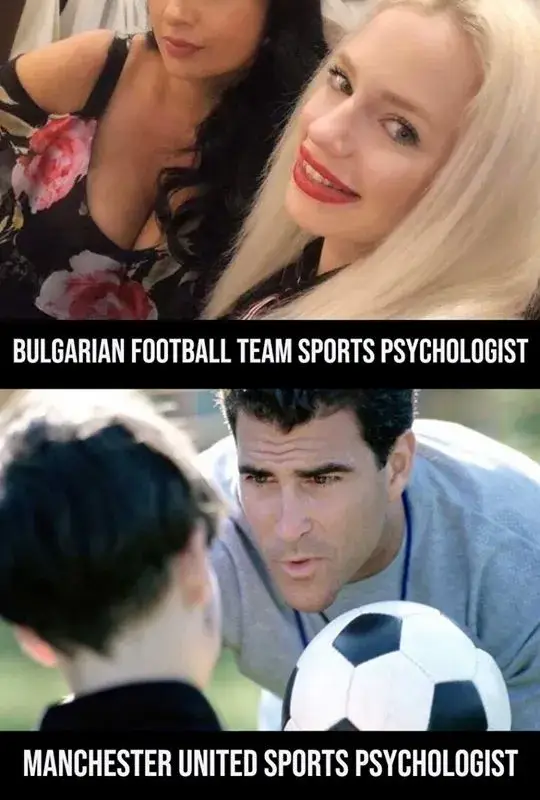 „Спортните психолози на българския футболен тим”. На другата снимка е показан мъж в спортно облекло, топка и дете, а текстът е : „Спортните психолози на „Манчестър Юнайтед”.