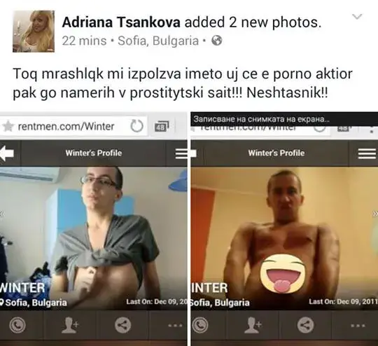 \"Измисля си, че се е снимал в порно, прави секс с дъртаци и после ги обира. Използва името на фолк певицата Адриана, за да си прави реклама, че и той като нея е снимал порно. Иска да си вдигне цената\", категоричен е потребителя.