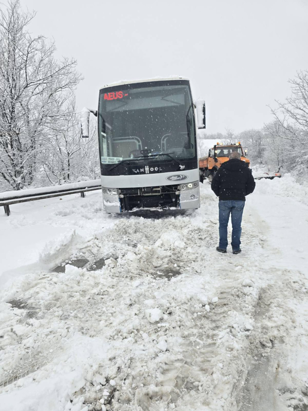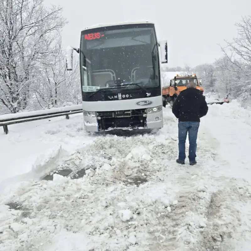 Пътниците вече са евакуирани, но инцидентът е само част от поразиите, които бурята оставя след себе си. В района на Кавлак има обърнат тир, а в Плевен 56 снегопочистващи машини не успяват да се справят с катастрофалните условия.