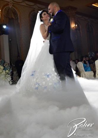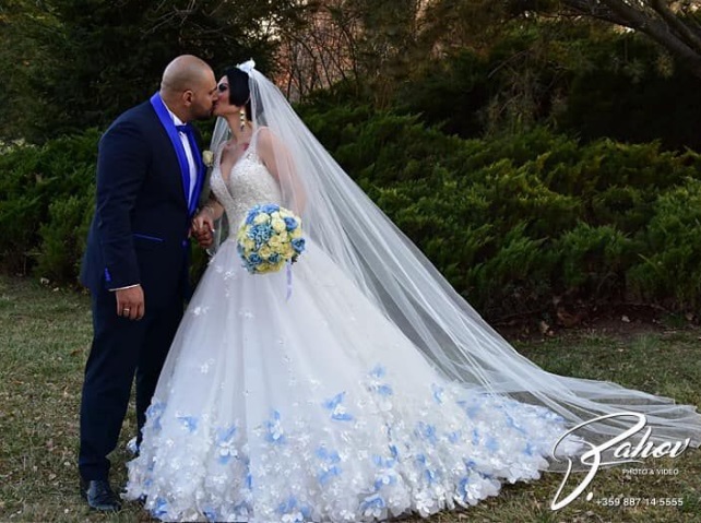 Щастливата булка грееше в романтична, обемна рокля в цвят off white с дълъг шлейф от шаферката София Борисова. Тоалетът е обшит в долната част с множество копринени цветя, комбинирани с изящни листа от нежен тюл. Повече от 2 месеца отне изработката на сватбената рокля, обсипана с изкрящи кристали Swarovski. Над 700 различни по големина цветя разцъфват върху нея, а 4 метровия воал е обшит с хиляди кристали и мъниста. Дизайнерката изработи и роклите на шаферките и на кумата Преслава.
