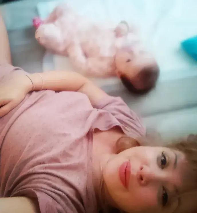 Момиченцето е снимано заедно с майка си. Лицето му не е съвсем на фокус, но все пак се вижда, че е много сладко. Кадърът бе публикуван от актрисата в социалните мрежи. Повод за това бе Денят на розовата фланелка – срещу агресията в училище.