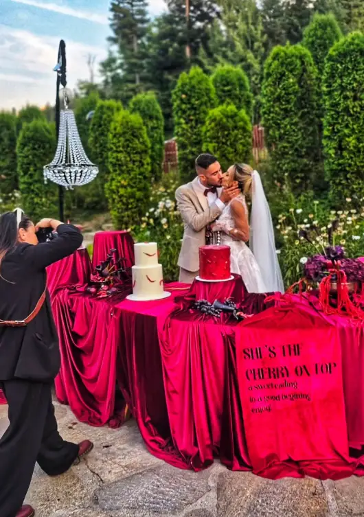 От снимките става ясно, че сватбата определено е била нетрадиционна. Всичко наоколо е в ярко червено, а на самата торта има декорация от най-лютите червени чушлета. Явно булката е решила да се „похвали“ с нрава си, който обаче малкият Карамански търпи стоически от години.