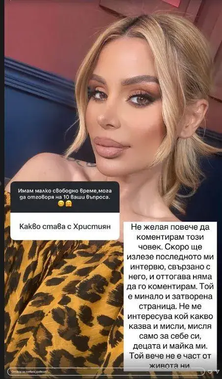 Бившата Гущеровица обясни, че има да дава още едно пространно интервю по въпроса с бившия си, след което не искала и да му чува името. Нещо повече – тя щяла да си вземе децата само за себе си и Християн нямало да ги види вече, освен на снимка. Плеймейтката допълни, че и без друго този „никаквец“ не се интересувал от малчуганите и явно няма да му е мъчно.