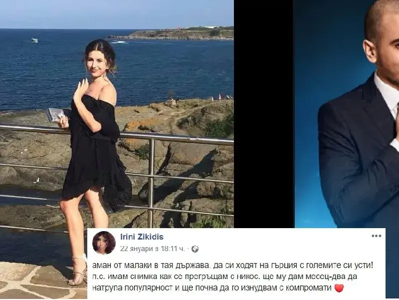 „Аман от „малаки” в тая държава. Да си ходят на Гърция с големите си усти! П.С. имам снимка как се прегръщам с Никос. Ще му дам месец-два да натрупа популярност и ще почна да го изнудвам с компромати”, пише тя в социалните мрежи.