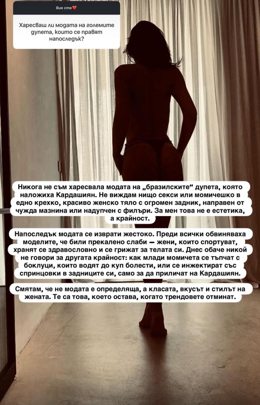 „Никога не съм харесвала модата на „бразилските“ дупета, която наложиха Ким Кардашиян. Не виждам нищо секси или момичешко в едно крехко, красиво женско тяло с огромен задник, направен от чужда мазнина или надупчен с филъри. За мен това не е естетика, а крайност“, категорична е Тафкова.