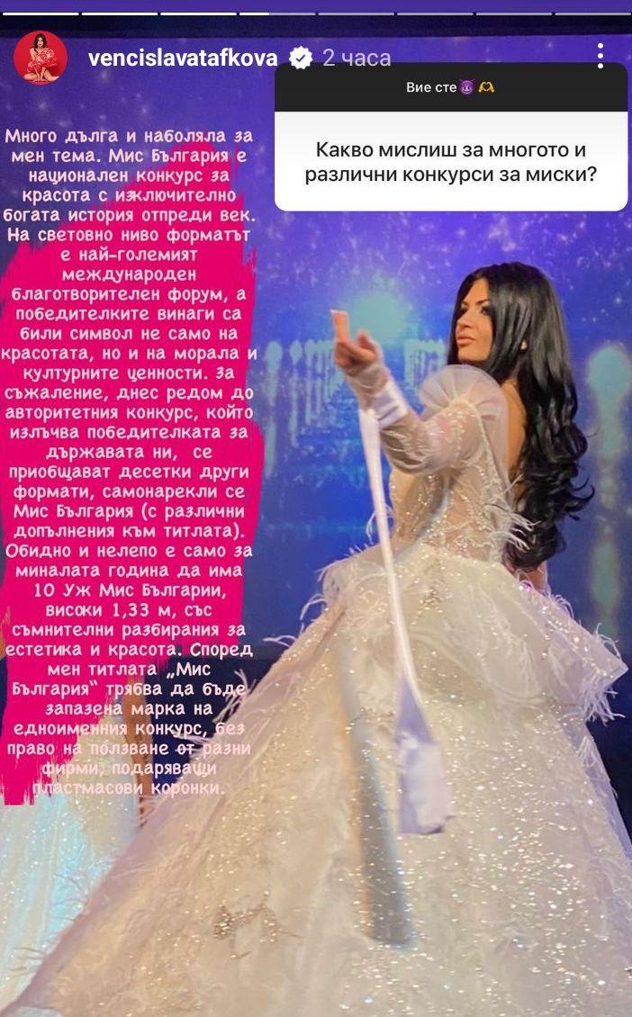 Попитана от свои последователи в Инстаграм какво е мнението й за нароилите се конкурси, моделката остро ги нападна. По думите й трябва да има ясно разграничение между националния конкурс „Мис България“ със 100-годишна история, който излъчва победителка на държавата, и останалите, ползващи същото име, пък макар и с добавки след него.