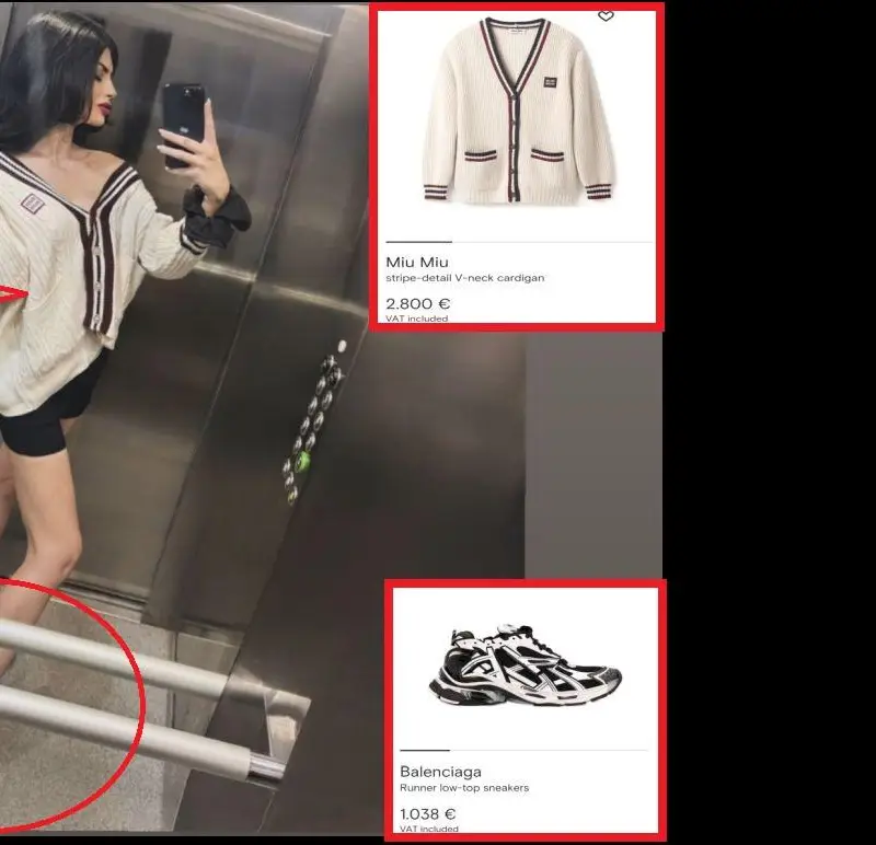 Какво?! Да, точно така! Пловдивската амбиция е избрала да се щракне от асансьора, облечена в Miu Miu, като на гърба си носи топла жилетка от марката, а под нея е... гола! Само кашмиреният пуловер е на стойност 5500 лева, а обувките на Balenciaga струват 2000 лева. Въпреки това, тя е комбинирала всичко това с късо лятно клинче, което е крайно неподходящо за мъгливото и студено време навън!