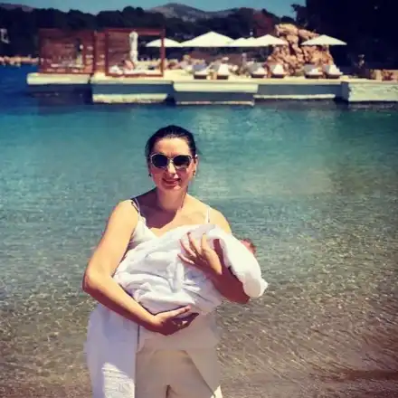 Наталия Кобилкина се възползва от хубавото време и заведе сина си на море. Новороденото бебе направи дебюта си в Бяло...